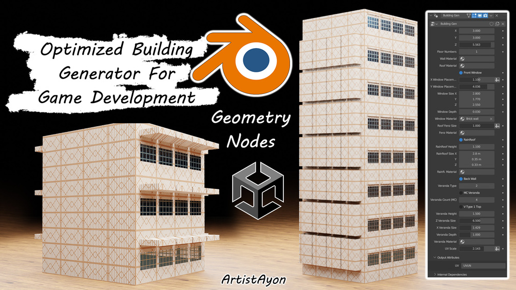 The Optimized Building Generator addon is a powerful tool that lets you generate various types of buildings using geometry nodes in Blender 3D. You can customize every aspect of your buildings by playing with some sliders. You can also add windows, doors, balconies, and roofs to your buildings. The addon is optimized for performance and memory usage, so you can create stunning scenes without slowing down your computer.